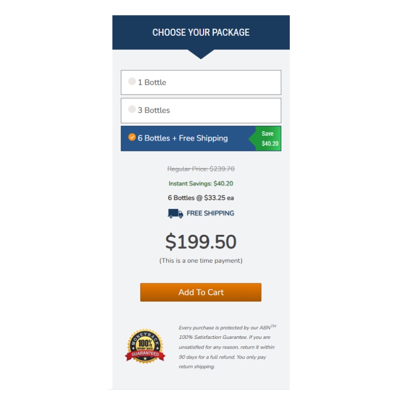 - 6 Bottles: $33.25 each, with free shipping (Total: $199.50)