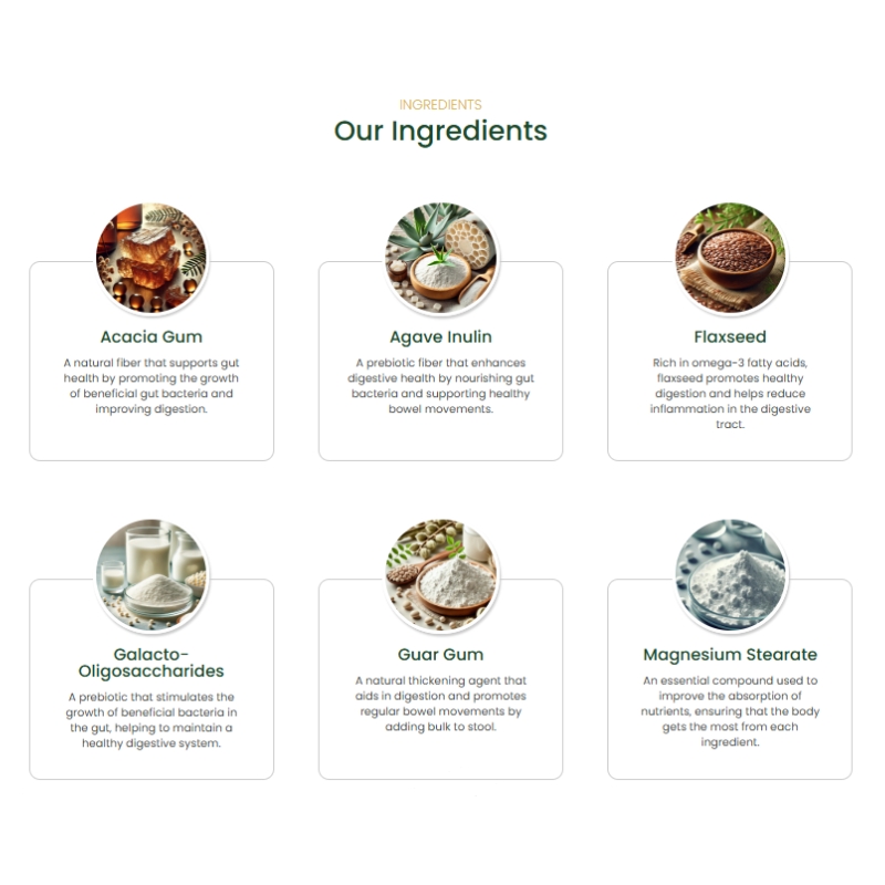 Goldenfrib comprises a unique combination of Acacia Gum, Agave Inulin, Flaxseed, Galacto-Oligosaccharides, Guar Gum, and Magnesium Stearate, each contributing distinct advantages for overall digestive wellness.