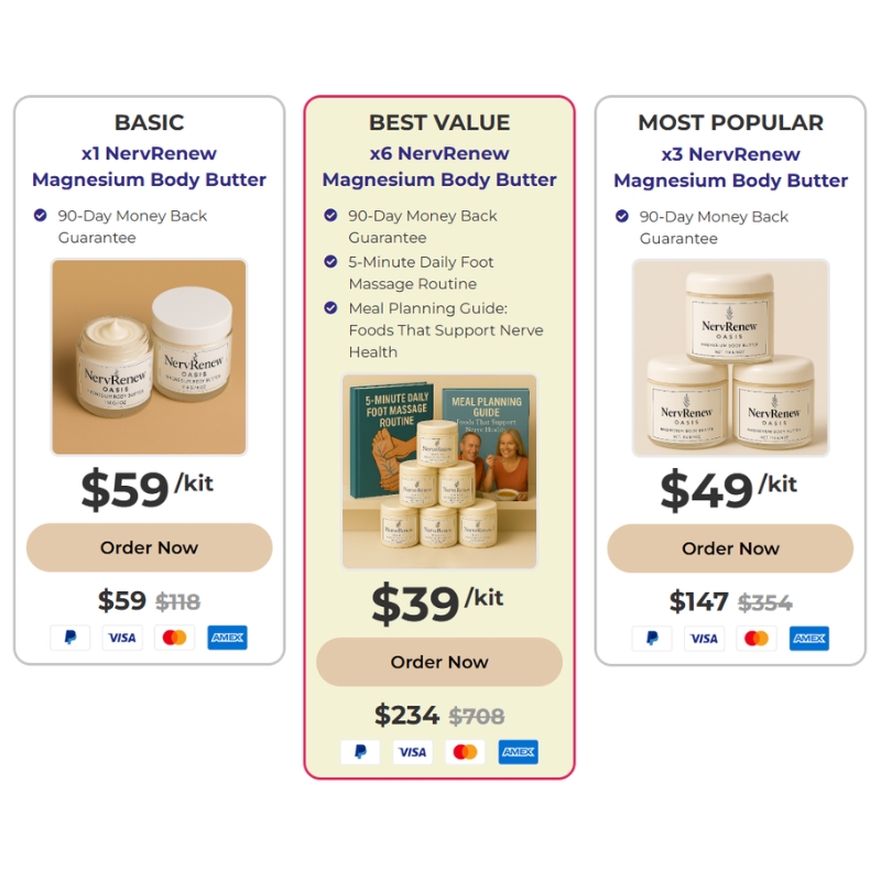 - Best Value: Six jars for $39 each, along with a 5-minute daily foot massage routine and a meal planning guide focused on foods that support nerve health, priced at $234 (regularly $708).