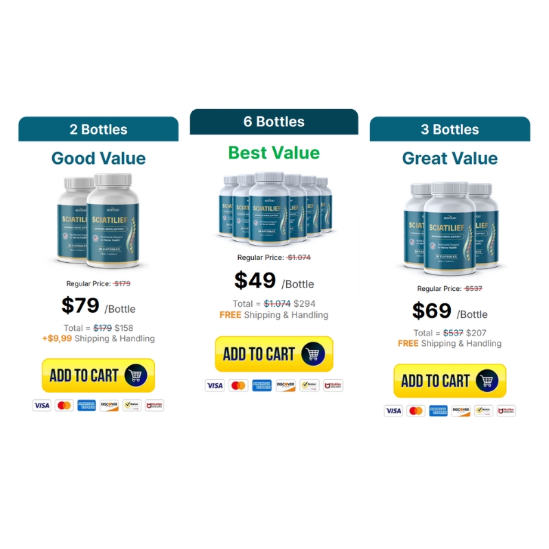 Pricing options for Sciatilief are structured to accommodate different purchasing preferences. A single bottle is priced at $89, with significant savings available for those who opt for multi-bottle purchases.