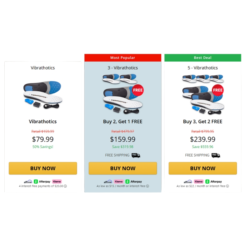 Vibrathotics is available at competitive pricing, making it accessible for individuals seeking relief from foot pain without breaking the bank. The pricing structure is designed to provide flexibility and value, with significant discounts available on bundled purchases.